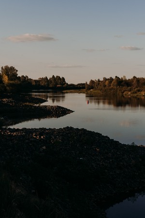 natural landscape with water. sunset and sunrise on the water. beautiful river. lake shore. reflection in the water. water flow. recreation on the shore of the reservoir.