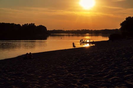 Silhouettes of people having a rest on the beach at sunset. Sunset on the Beach.
