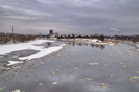 Urban landscape with river Warta and the cathedral towers in winter in Poznan