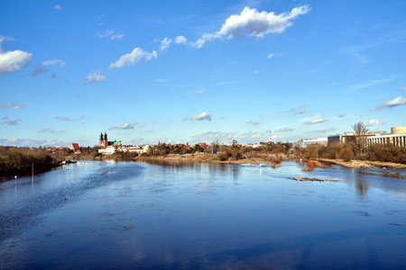 Historic buildings and towers on the Warta River in the city of Poznan, Poland