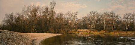 Sandy Shore River and Deciduous Forest on Cloudy Weather. Panoramic Countryside Landscape. Autumn Season, October. Web Banner. Natural Background.