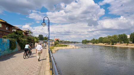MAGDEBURG, GERMANY - JULY 08, 2019: Walkers on a promenade on the banks of the River Elbe in Magdeburg