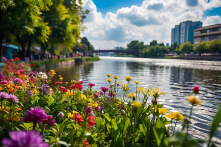 Colorful flowers on the banks of the river. Spring landscape.