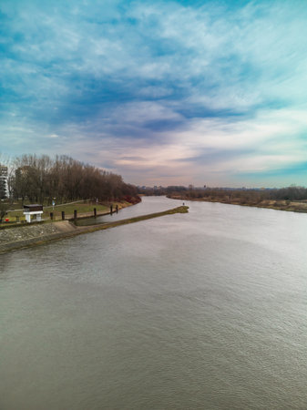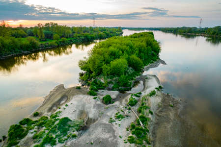 The Vistula, the largest Polish river. View from a drone near Warsaw. The beautiful river and wild banks are a great attraction and a habitat for many species of animals.