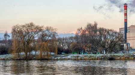 Smoking chimneys of thermal power plants near the waterfront in city. Winter. Industrial and nature background. Ecological concepts.