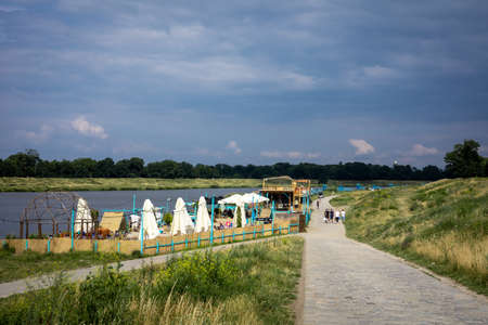 A path along the Odra riverside, Wroclaw, Poland. Beach bar Basen. 8 July 2021.