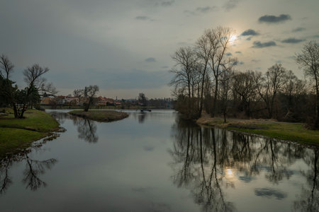 Sobeslav town and fresh Luznice river in winter cloudy sunny morning