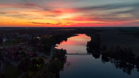 Golden red sunlight AERIAL view, Russia, River, small town, bridge