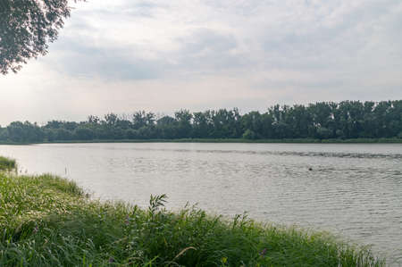 Green grass on the border of the river with cloudy sky on the background