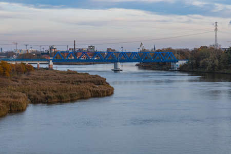 Wroclaw, Poland - November 15 2020: Blue long railway bridge over Odra river at cloudy day