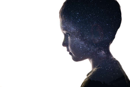 Isolated combination of the silhouette of a child face and the stars of the Milky Way. Concept of the connection between man and the universe, new discoveries and space exploration