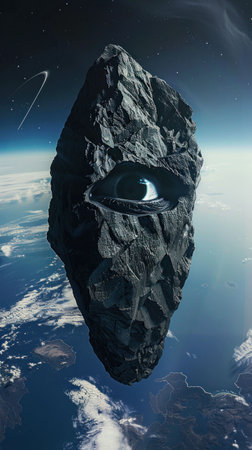 abstract stone with an eye, space background, dark tones, cosmic elements, surreal concept of observation and mystery, exploring the unknown in vastness of the universe, imaginative design