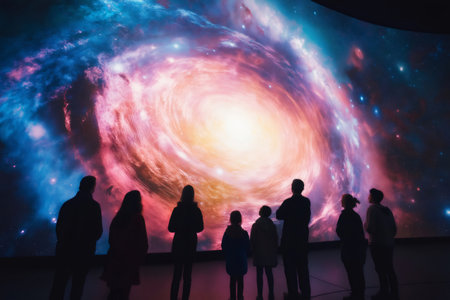 Silhouetted people enjoying a cosmic experience, watching a vibrant spiral galaxy projected on a large screen in a dark planetarium