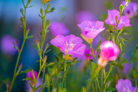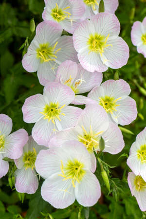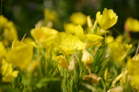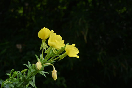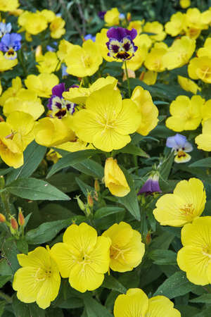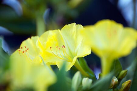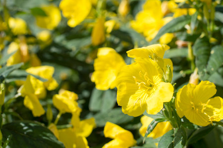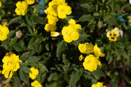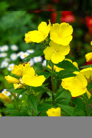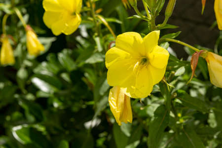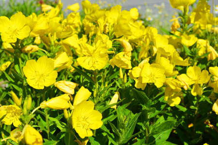 Night flowers. Yellow evening primrose flowers (Oenothera). Decorative plants in a flower garden.