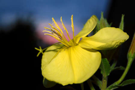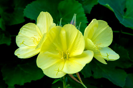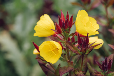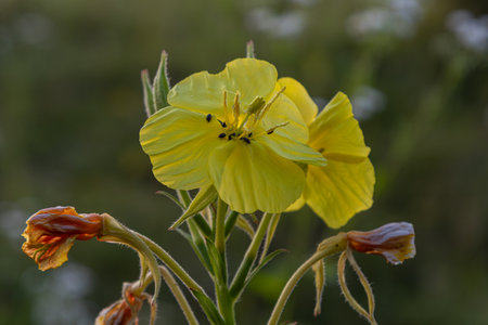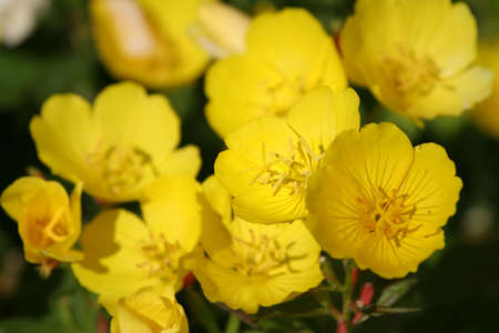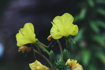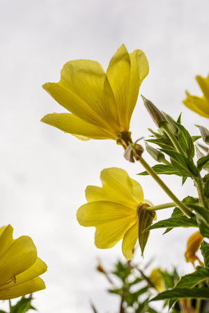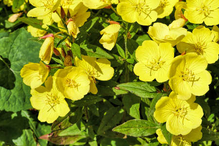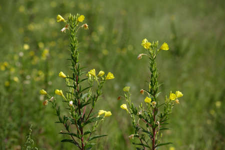 Flowers of the medicinal plant Oenothera biennis. Beautiful flowers of the night plant close-up.
