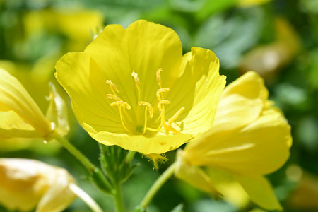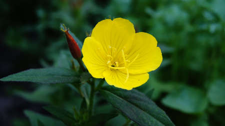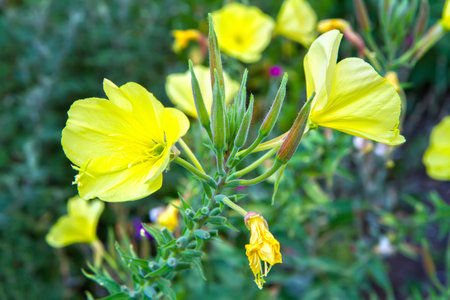 Beautiful blooming yellow enotera in the summer garden. High resolution photo. Selective focus. Shallow depth of field.