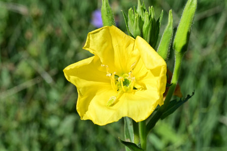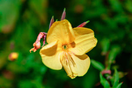Beautiful, very large buds of street yellow flowers growing on the street yard. Oenothera is the type genus of the family Onagraceae.