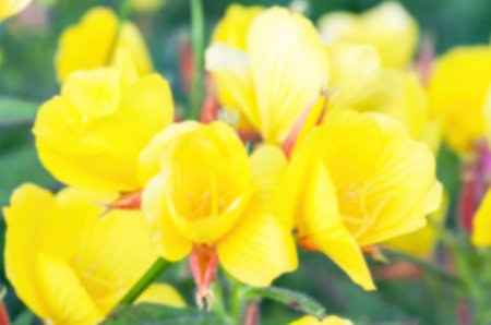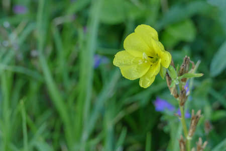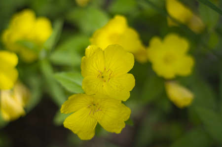 Common Evening Primrose (Oenothera biennis) in garden. Yellow small garden flowers. Small field flowers as a background for postcards, greetings, paintings.