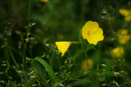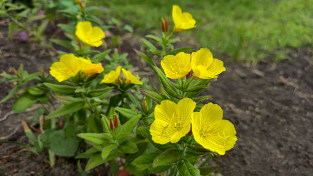 Dewy evening primroses in the flowerbed in the ornamental garden in a rainy day, nature and herb concept.Yellow evening primrose (Oenothera biennis), medicine plant for cosmetics, skin care and eczema