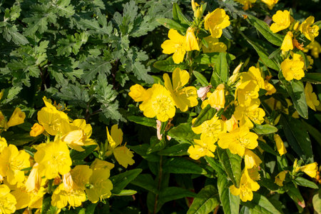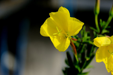 Yellow large flowers of an evening primrose quadrangular growing on the street. Colorful and festive background with many cool colors illuminated by the sun, oenothera tetragona glauca.