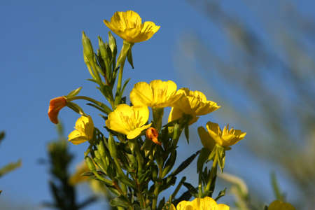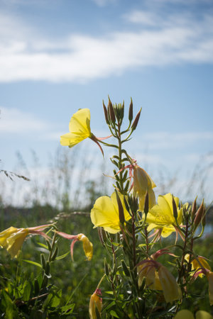 closeup of eonothera yellow flowers in a meadow on blue sky background