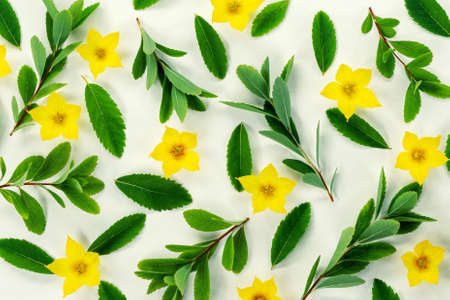 Delicate yellow spring wildflowers with green twigs on a white background.
