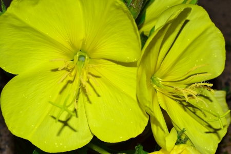 Yellow flowers Oenothera Erythrocephala . Flowers blooming in the moonlight
