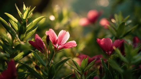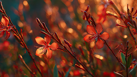 The Gaura at sunset, Golden red sunset light filters through the leaves, still atmosphere, warm orange glow blending with natural green tones.