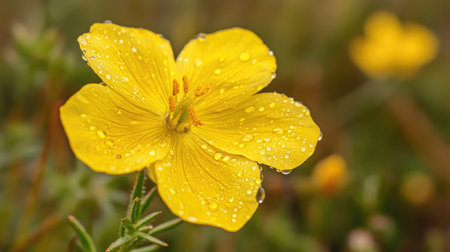 A close-up of a bright yellow flower with water droplets on its delicate petals, captured in the early morning.