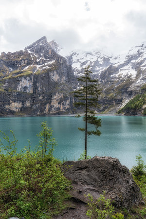 A tree with the view of Oeschinenee Lake and Oeschinen valley amongst Bernese Alps mountain tops. Famous tourist attraction in Switzerland