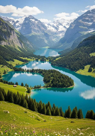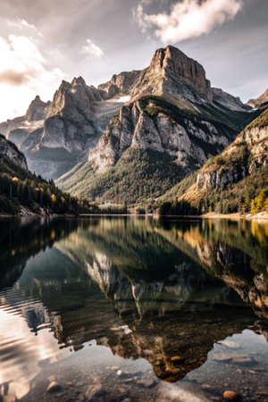 magnificent mountain landscape, majestic cliffs, mountain lake, reflections on the lake surface, Swiss Alps, Summer