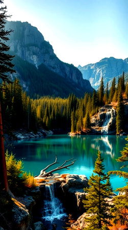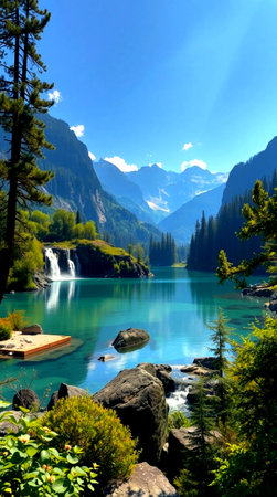 A lake nestled amidst towering mountains in the heart of a dense forest. The serene water reflects the rugged peaks and lush greenery surrounding it, creating a tranquil and picturesque scene.