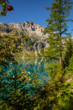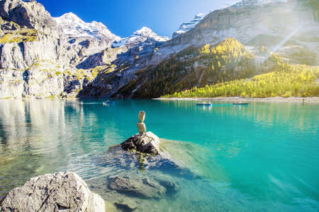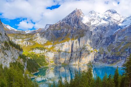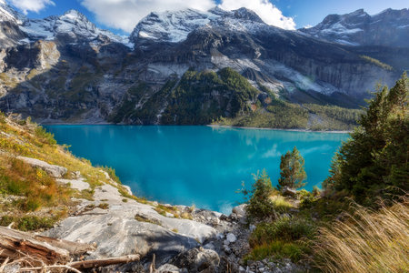 Stunning alpine lake and great view with snowy mountains at early autumn, lake Oeschinensee, Kandersteg, Bernese Oberland, Switzerland, Europe
