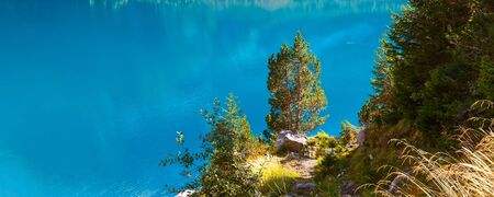 Panoramic banner view of lake Oeschinensee and green pine tree, Swiss Alps, Switzerland