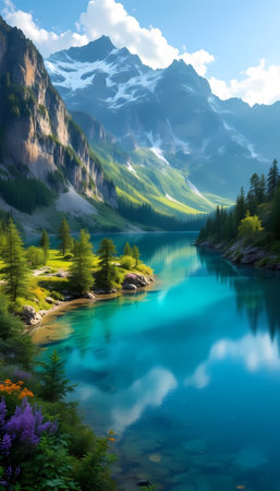 A serene lake nestled among lush green mountains and trees under a blue sky