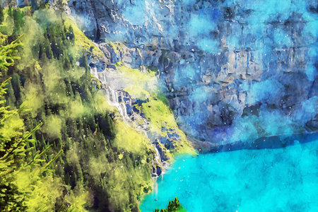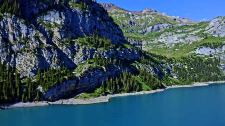 View of the lake Oeschinensee. Swiss alps, Switzerland, Kandersteg district. Blue mountain lake with pine trees and mountains in background.