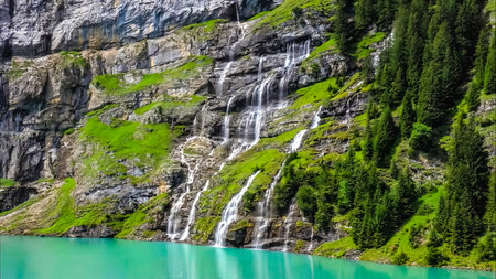 Amazing tourquise Oeschinnensee with waterfalls and Swiss Alps, Kandersteg, Berner Oberland, Switzerland.