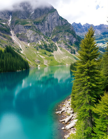 Panoramic view of idyllic alpine lake with clear turquoise water, green forest and high mountains in background. Picturesque spring landscape.