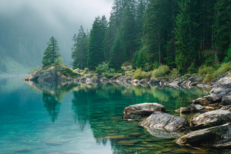 A peaceful alpine pond nestled among towering pines and rugged rocks, its vibrant turquoise waters mirroring the soft foggy sky and untouched wilderness.