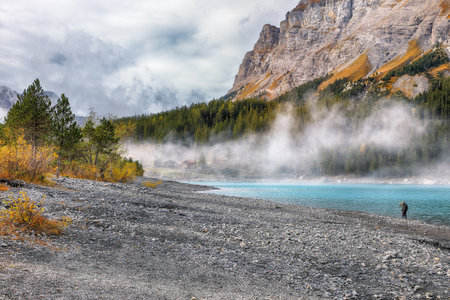 Tourist in the mountains in Switzerland on Lake Oeschinensee