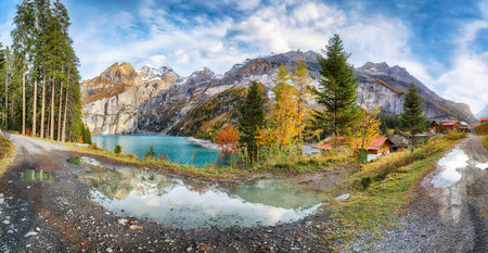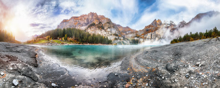Autumn panorama of Oeschinensee or Oeschinen lake and Swiss Alps near Kandersteg, Switzerland