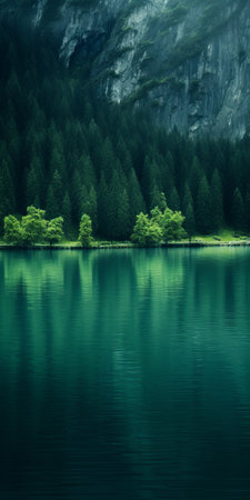 the lake wallpaper captures a tranquil scene with dark green and light aquamarine waters. the webcam photography showcases the juxtaposed imagery of mountainous vistas in a swiss style. the dark turquoise and light brown hues create a calming and introspective aesthetic, making it a perfect choice for those seeking a soothing and serene atmosphere in their space. ai generated