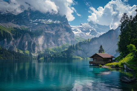 Oeschinnensee lake, wooden chalet and Swiss Alps, Berner Oberland, Switzerland banner