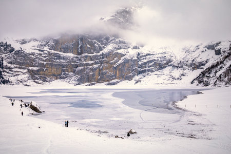 People spending day by frozen lake in snowy mountain landscape on a cloudy day in Switzerland