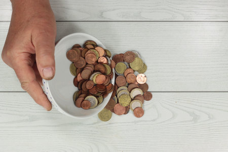 Bunch of coins in plastic cup isolated on a white background. Copy space for the text.