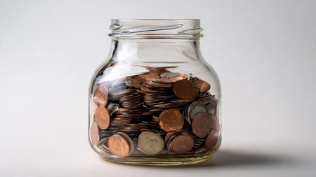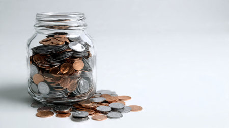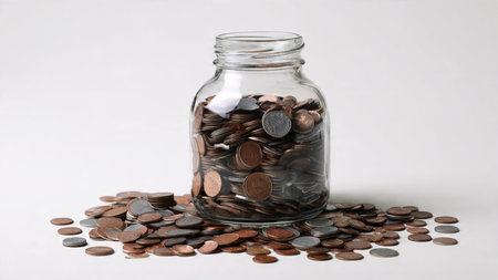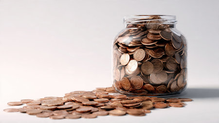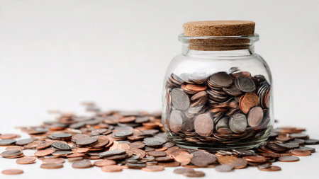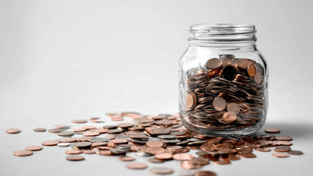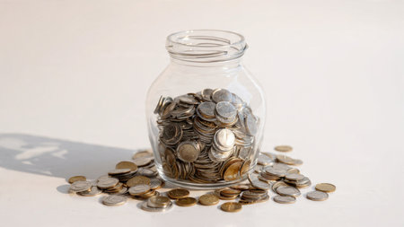 Elegant studio-lit scene showing a jar with a few coins spilled lightly around it, commercial-safe.
