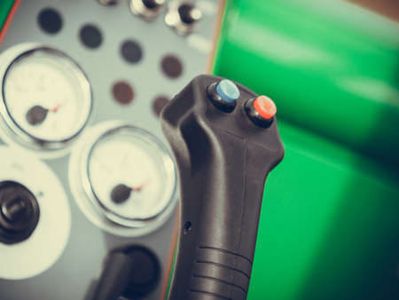 Close up detail of levers knobs on new tractor machinery industrial detail