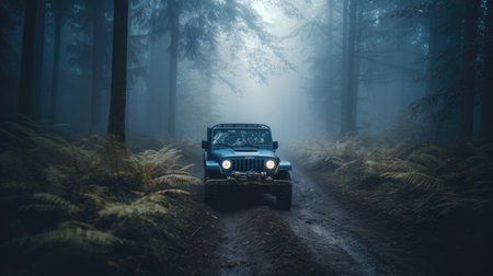 Low angle view of front of SUV on mountain road. Extreme off road tour in a forest. Off-road car on mountain road.