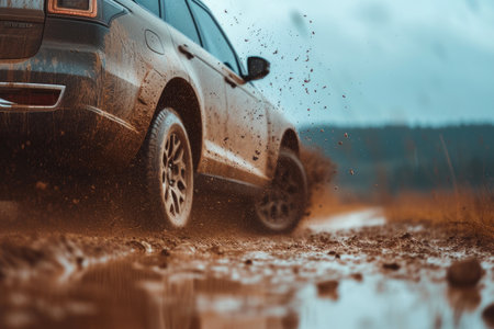 Classic offroad suv jumps on a muddy track. Mud flies from the wheels creating strong dynamic movement under cloudy sky.