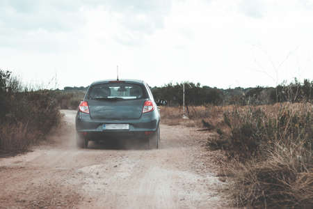 Cloud of dust behid a car driving through a dry unmade road